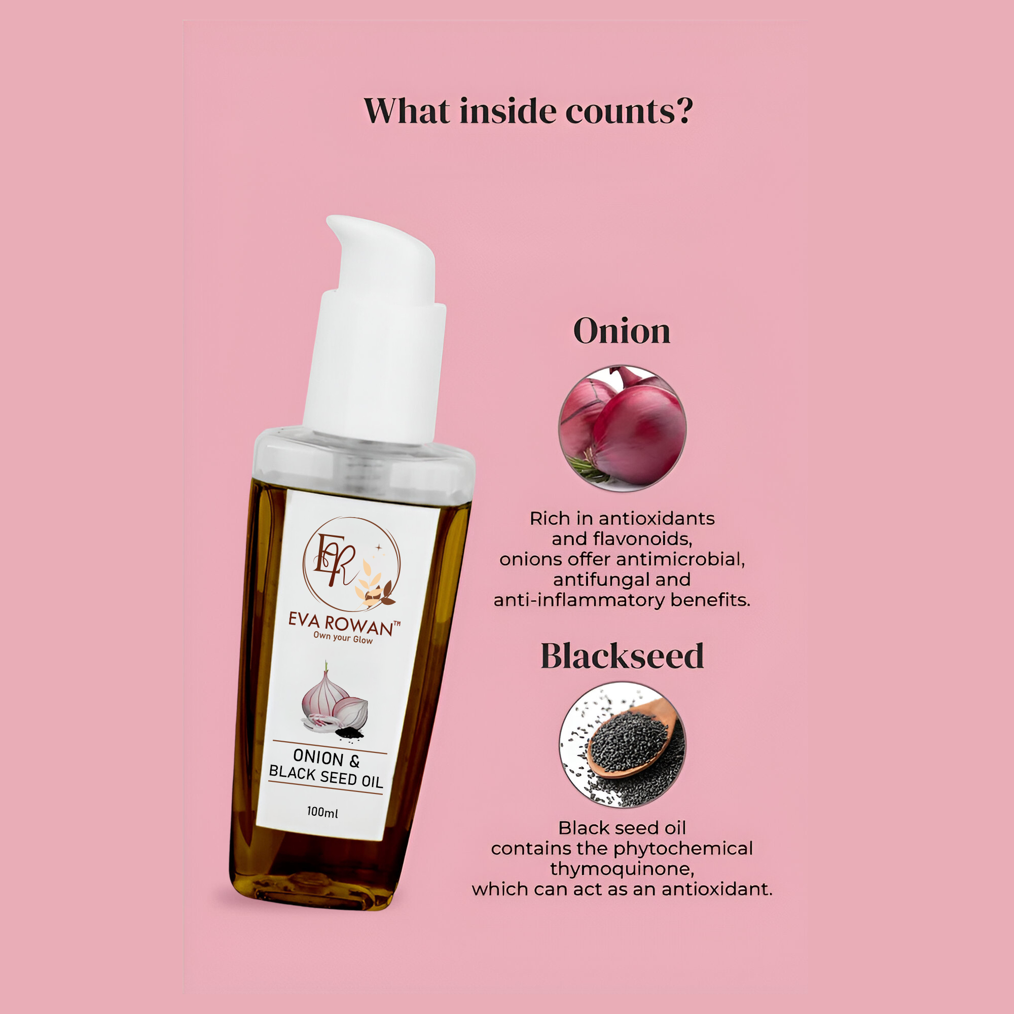 Eva Rowan Onion & Black Seed Oil is enriched with the potent blend of Onion Extract and Black Seed Oil — a nourishing duo that helps strengthen hair roots, reduce hair fall, and promote healthier, thicker hair. This powerful combination makes Eva Rowan the perfect oil for revitalized, vibrant hair.